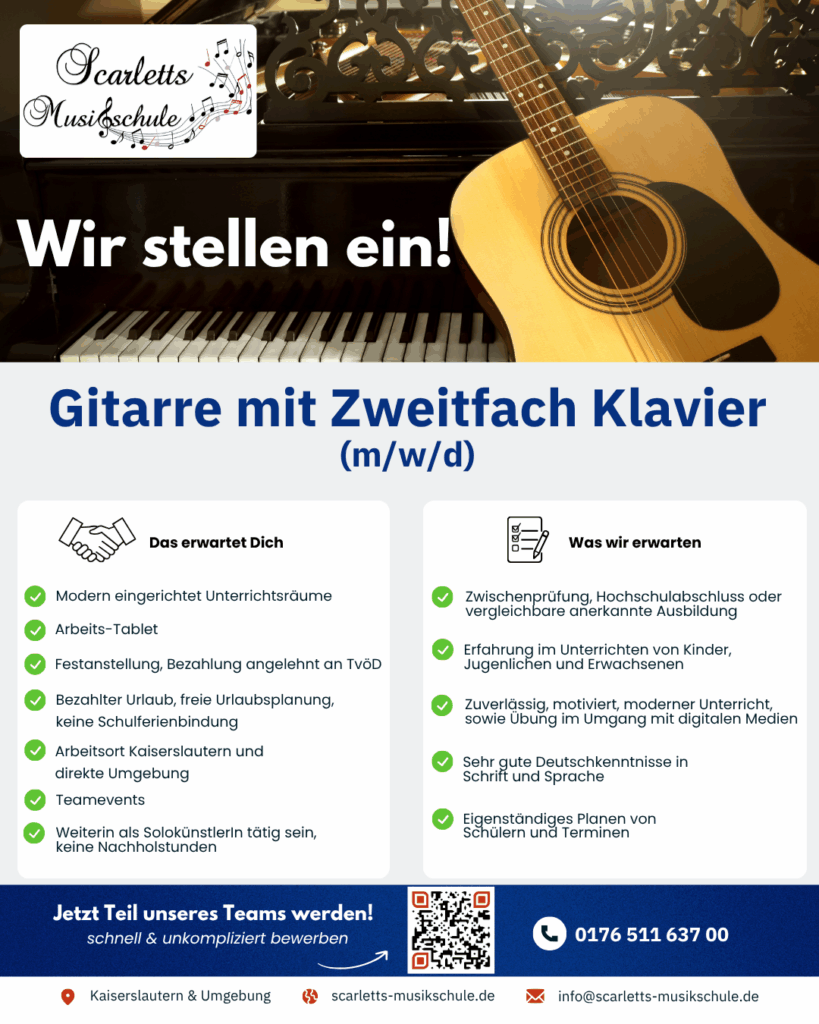 Wir suchen für unseren weiteren Standort Gitarrenlehrer/in (m/w/d) im Angestelltenverhältnis.